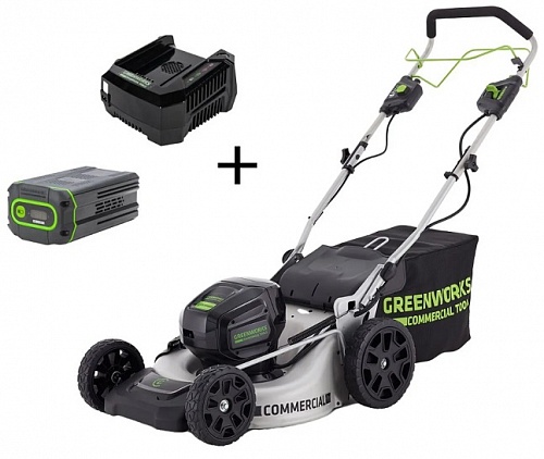 Состав комплекта:Газонокосилка аккумуляторная Greenworks Арт. 2502007, 82V;Аккумулятор 5 Ач 82V Commercial;Зарядное устройство 82V Commercial; Заглушка для мульчирования;Вставка для бокового выброса;Травосборник;Руководство по эксплуатации;Гарантийный талон.
