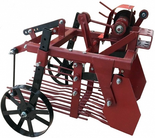 Обратный звонокКартофелекопалка ККМ-1С для мотоблока предназначена для механизированного выкапывания клубней картофеля из земли, укладывания на поверхность для дальнейшего ручного собирания. Модуль состоит из активного лемеха (ножа) и просевной решетки (грохота). Возможно регулирование глубины выкапывания с помощью опорных колес, мягкость сепарации грунта регулируется с помощью оборотов двигателя мотоблока. Агрегатируется с мотоблоками типа «САЛЮТ», «АГАТ» и мотоблоками аналогичной конструкции.