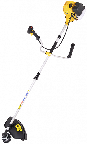 Обратный звонокТриммер Huter GGT-1500S модель большой мощности с транспортировочным разъемом на штанге. Разъем позволяет косу длинной под два метра разобрать пополам, что в свою очередь существенно упрощает перевозку в автомобиле или хранение в гараже. Двухтактный двигатель триммера развивает мощность более 2х лошадиных сил и раскручивается до 9500 оборотов в минуту. Большой мощности удалось достигнуть благодаря установке на поршень второго кольца, что в свою очередь привело к увеличению компрессии в цилиндре. Триммер Huter GGT-1500S имеет удобную широкую Т-образную рукоятку как у профессионального инструмента. Благодаря такому типу рукоятки и плечевому ремню входящему в комплект поставки, достигается идеальная развесовка и уменьшается нагрузка на оператора при работе. Ручка газа и кнопка зажигания вынесены на рукоятку Ручка газа имеет двойной замок, защищающий от случайного нажатия, а также есть стопор, освобождающий руки при зажатии. В комплект входят полуавтоматическая катушка с леской и стальная фреза. Леска быстро справится с травой и не засохшим сорняком, а фреза с кустарником и сухостоем. Вал косы расположенный в стальной штанге вращает режущий элемент через угловой шестеренчатый редуктор. Над редуктором крепиться широкий пластиковый защитный кожух. Триммер Huter GGT-1500S подойдет для окашивания травы и сорняка на площадях до 15 соток.